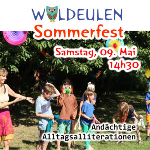 SOMMERFEST Waldeulen Lernverein: Das heurige Sommerfest steht auch heuer ganz unter dem Motto unseres Buches “Andächtige Alltagsalliterationen”. Ein Fest mitten im Grünen mit Kindern und Erwachsenen. Theater mit Musik und Tanz, zusätzlich Geschichtenerzählung von Gerti Meitz. Eintritt und Buffet: freie Spenden. Wir freuen uns über regen Besuch! Huhuhuhuuuu!